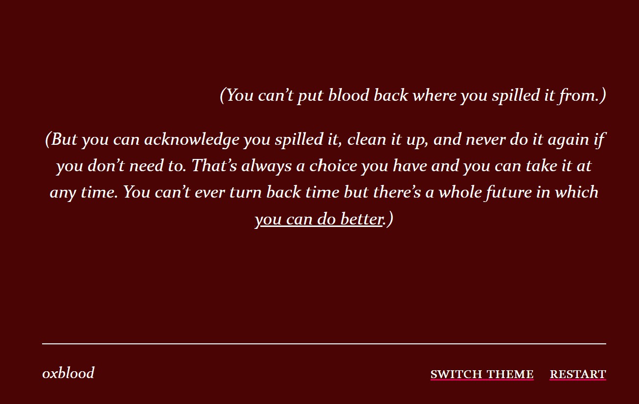 Made for Shufflecomp 2025. More or less based on following songs: Erlkönig by Franz Schubert, Becky's So Hot by FLETCHER, Don't Stop Believin' by Journey, Alice by Sisters of Mercy, Untamed Region by Jenny Hval, and Sinking Boat by Infinity Song.